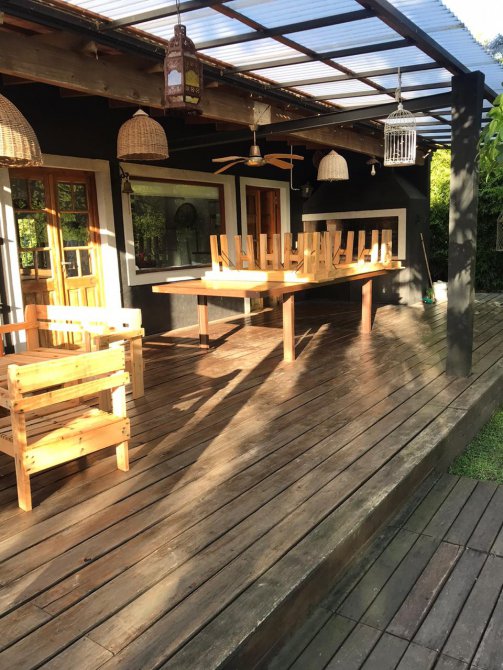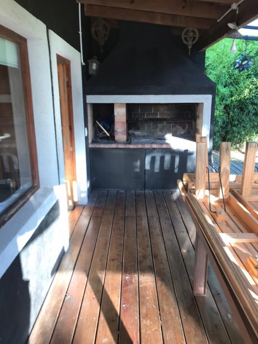 EN SU PARTE TRASERA SEMICUBIERTA SE ENCUENTRA LA PARRLLA, Y UNA GALERIA CON PISOS EN DECK.