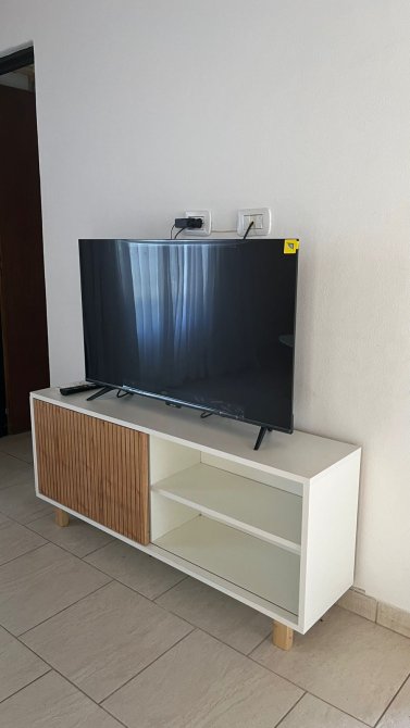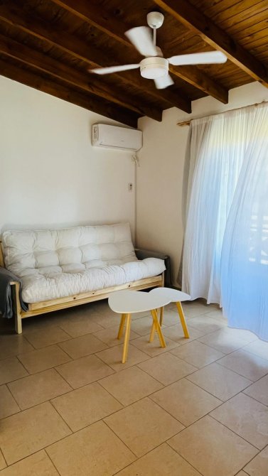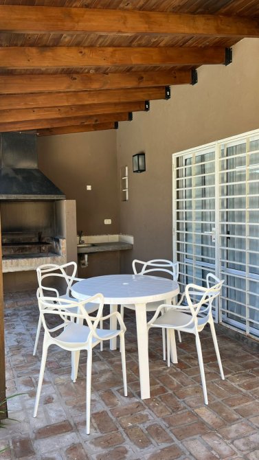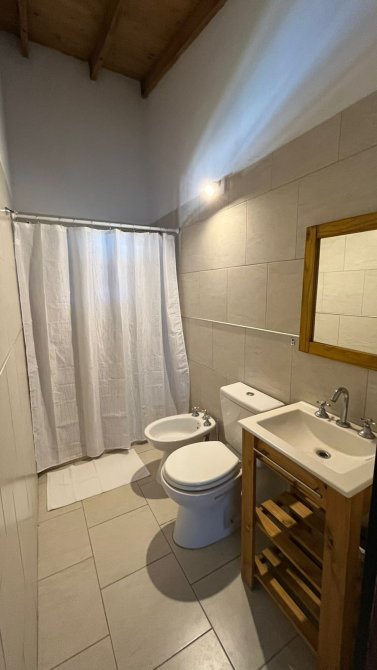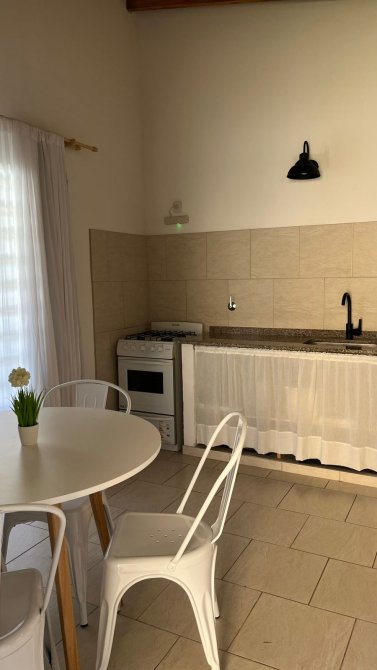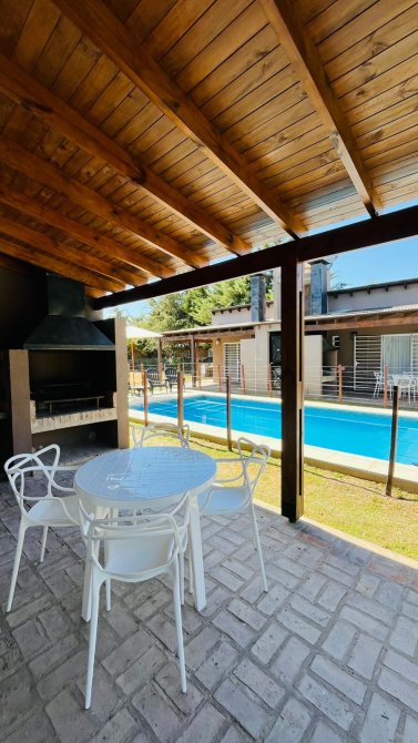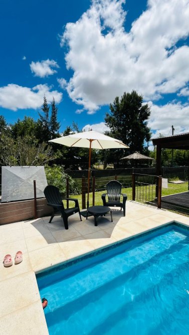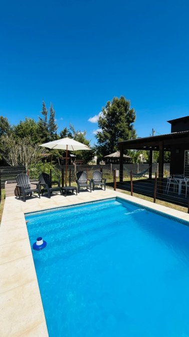cada cabaña tiene aire frío calor de 3000 frigorias, heladera con freezer, cocina cuatro hornallas a gas, smart TV 43”, tostadora, cafetera y pava eléctrica, vajilla y batería de cocina completa, sommier dos plazas Cannon, futon dos plazas, mesa de living, de TV y de comedor con 4 sillas tolix, cortinas de tusor y black out en todas las ventanas, Blanqueria completa (sábanas y toallas), juego de jardín con mesa y 4 sillas y sillones para la pileta