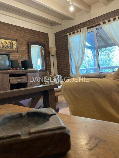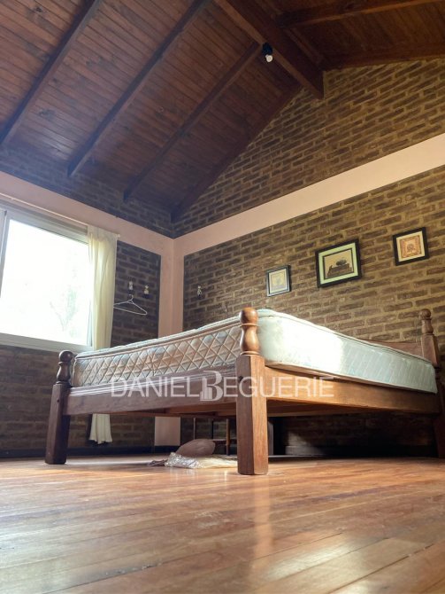 El techo con un diseño de tirantes a la vista, y de color oscuro dan una calidez única al inmueble.