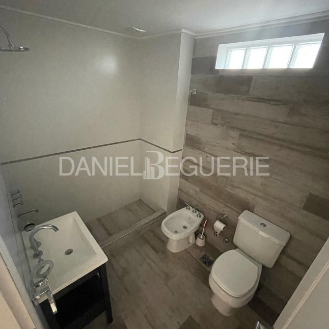 Baño completo, amplio y con detalles en el piso y paredes con porcelanato simil madera de alta calidad.
